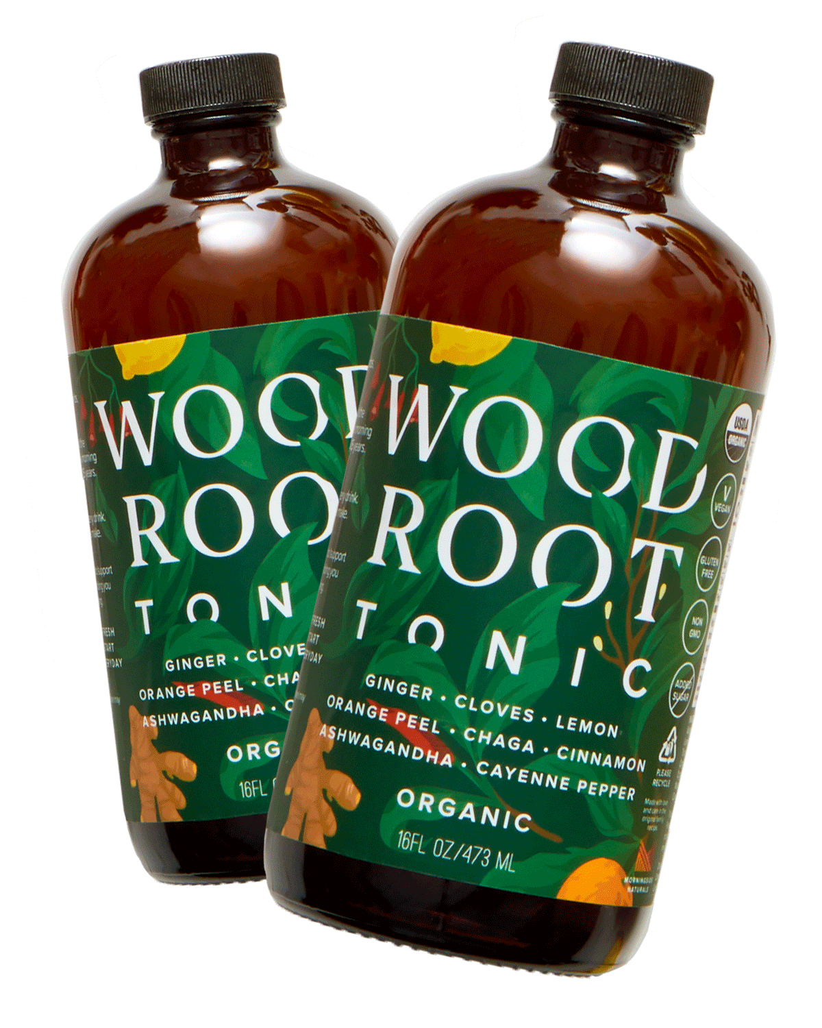Water, Organic Apple Cider Vinegar, Organic Lemon Juice, Infusion of Organic Woodroot Tonic (Organic Cinnamon, Organic Ginger, Organic Clove, Organic Ashwagandha Root, Organic Lemon Peel, Organic Chaga Mushroom, Organic Orange Peel, Organic Cayenne Pepper)
